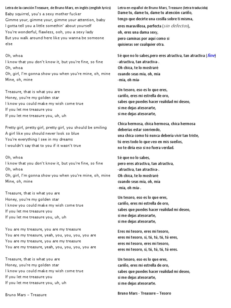 Bruno Mars- Teasure Lirik lagu Intro Baby squirrel yous a sexy mother-fucker. The genre of this track was explained by Bruno Mars in an interview for VH1 when he said This is me locking myself in the studio and being free recording whatever it. Bruno Mars Baby squirrel yous a sexy mother fucker Gimme your gimme your gimme your attention baby attention baby I gotta tell you a little somethin about yourself self self Youre wonderful flawless oh you are a sexy lady sexy lady But you walk around here.